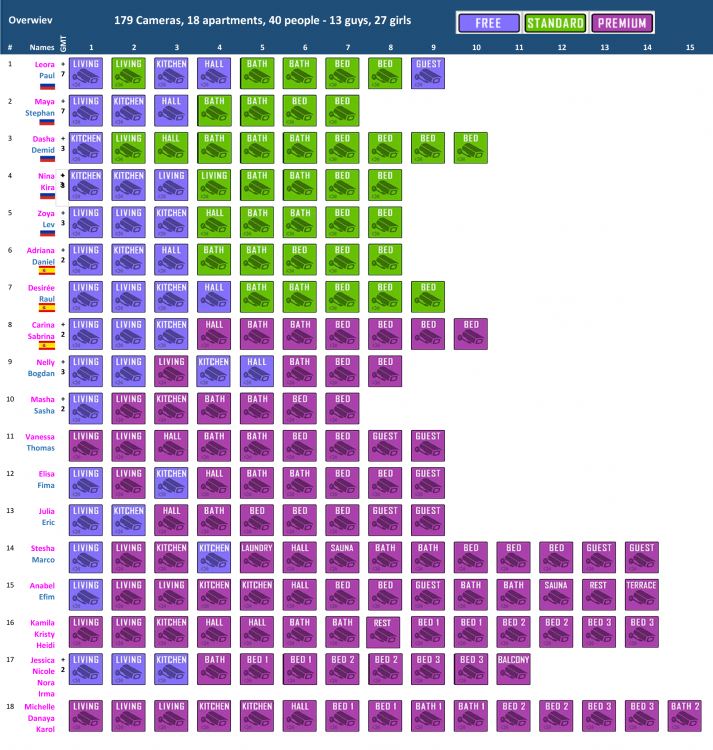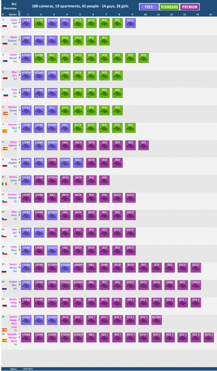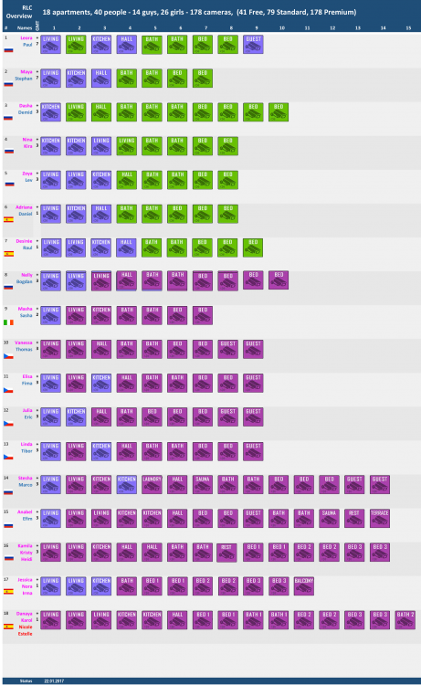I am curious. So I wanted to know what we really get in the different membersphips or RLC. Here a first overview about the 18 apartements. Maybe there are still some errors in this list, and it is not yet complete. So I don't know the exact coutry of all locations. And the corresponding timezone. I am happy if you help me and give the missing information if you know it (no guesses please). Actually there are 179 cameras (a few of them rather senseless…) and we should see 13 guys and 27 girls in 18 apartements. (Or shall I count Elvis twice? 1 girl AND 1 guy? )